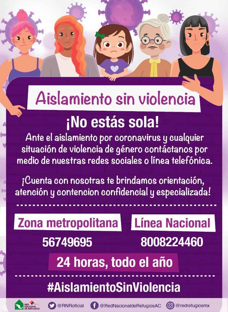 A través un comunicado, la Red Nacional de Refugios explica que es muy probable que una mujer en aislamiento con su agresor no pueda hacer una llamada o contactar a alguna instancia. Por lo que, se hace un llamado a la sociedad en general a llamar a la policía y dar seguimiento al reporte, en caso de escuchar gritos, insultos o golpes en la vivienda de alguna vecina.